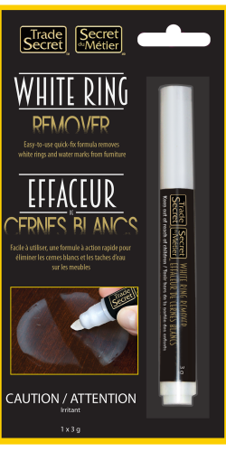 The Trade Secret™ White Ring Remover Marker will remove most white rings and water marks from finished wood surfaces. They disappear without stripping, refinishing or harming the finish. It can be used on varnishes, lacquers, French finishes and harder contemporary finishes.